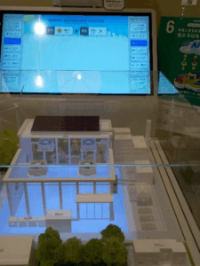 本展示のEMSは、電気料金や天気予報、蓄電池の残量などをクラウド上でAIが分析し、その時点で最も効率的な電力利用を自動で判断します。よりスマートな省エネが期待されます。
