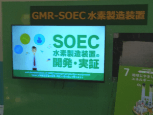 本展示のSOEC(固体酸化物形水電解装置)は、高温の水蒸気を電気で分解して水素をつくる技術です。電気と熱の両方を利用できるため、従来よりも高いエネルギー効率を実現します。
