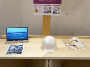 本展示では、ホタテの貝殻を使って防災ヘルメットやベンチを製作する技術を紹介しています。CO₂の固定化だけでなく、廃棄物の再利用による環境負荷の低減も実現します。